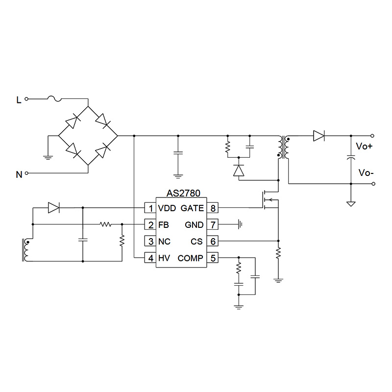 AS2780 — это контроллер постоянного выходного напряжения с высоким коэффициентом мощности, низким общим гармоническим искажением и управлением на первичной стороне. Чип имеет встроенную схему запуска при высоком напряжении, которая может удовлетворить требования быстрого запуска и сверхнизкого режима ожидания.