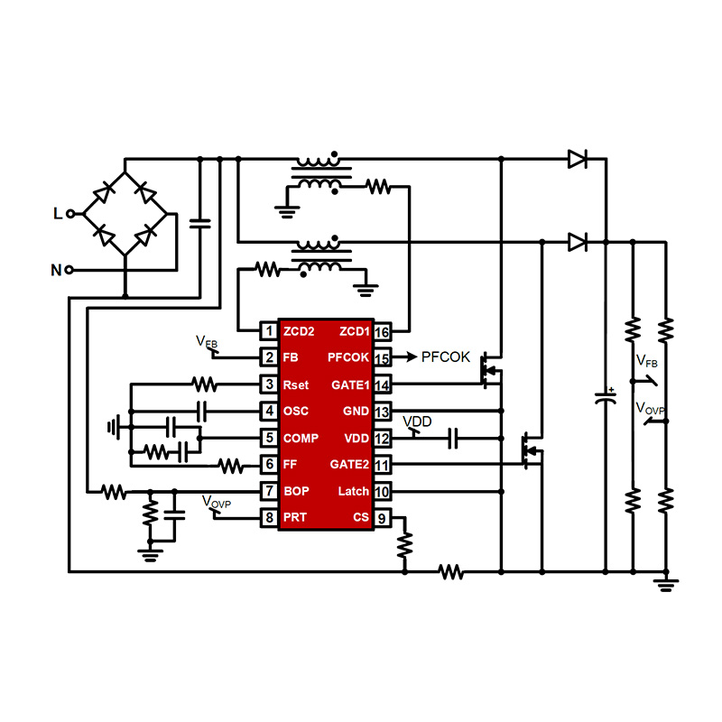 AS6A31N — это двухфазный контроллер с чередованием критического повышающего режима (CRM Boost) с коррекцией коэффициента мощности (PFC) при постоянном напряжении.