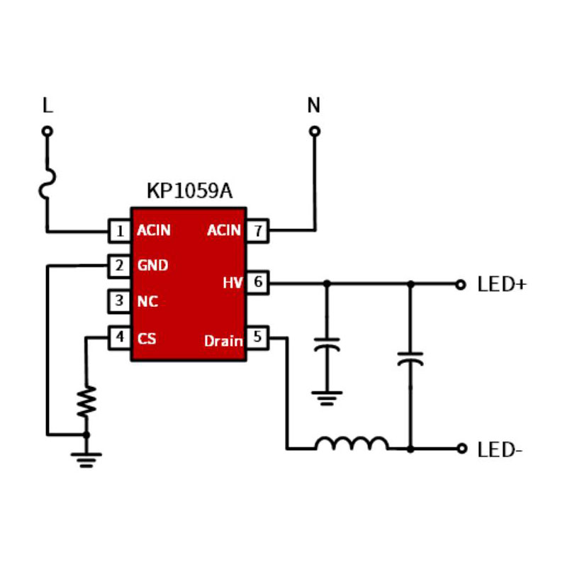 KP1059AWPA — это высокоинтегрированный выключатель питания с квазирезонансным понижающим (QR-Buck) управлением постоянным током (CC) для светодиодного освещения.