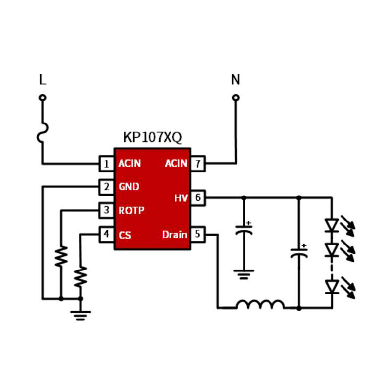 KP1070QWPA — это высокоинтегрированный выключатель питания с квазирезонансным понижающим (QR-Buck) управлением постоянным током (CC) для светодиодного освещения без вспомогательной обмотки.