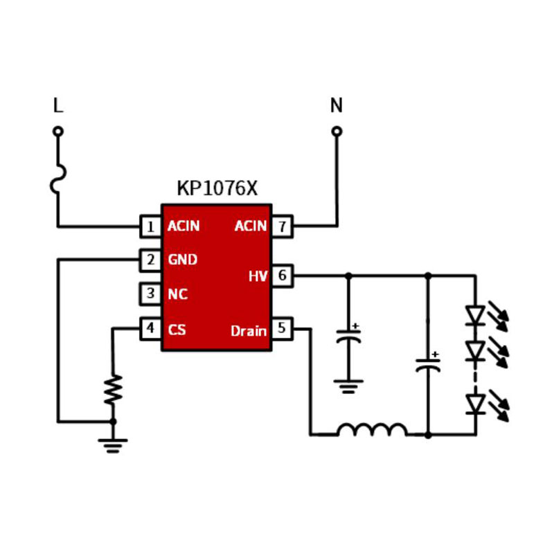 KP1076X — это высокоинтегрированный выключатель питания с квазирезонансным понижающим (QR-Buck) управлением постоянным током (CC) для светодиодного освещения без вспомогательной обмотки.