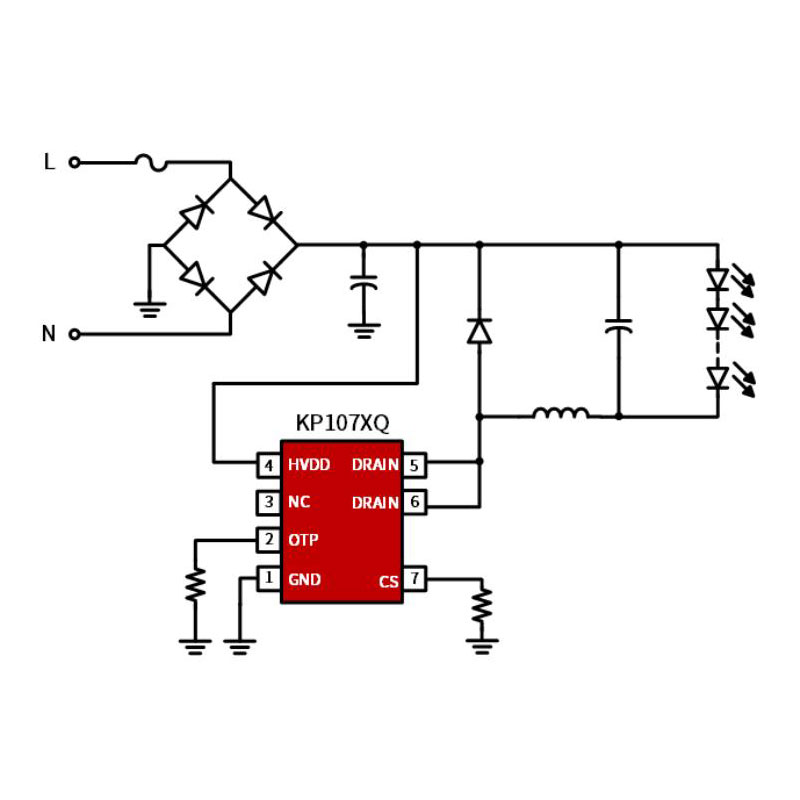 KP107XQSPA — это высокоинтегрированный выключатель питания с квазирезонансным понижающим (QR-Buck) управлением постоянным током (CC) для светодиодного освещения без вспомогательной обмотки.