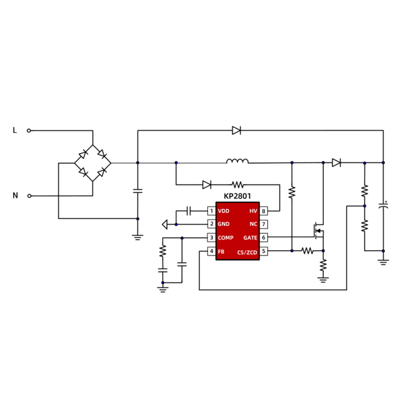 KP2801SGA Встроенная схема запуска и питания высокого напряжения без внешнего источника питания позволяет обеспечить быстрый запуск и функцию питания. Кроме того, технология обнаружения размагничивания без вспомогательных обмоток упрощает конструкцию системы и снижает производственные затраты.