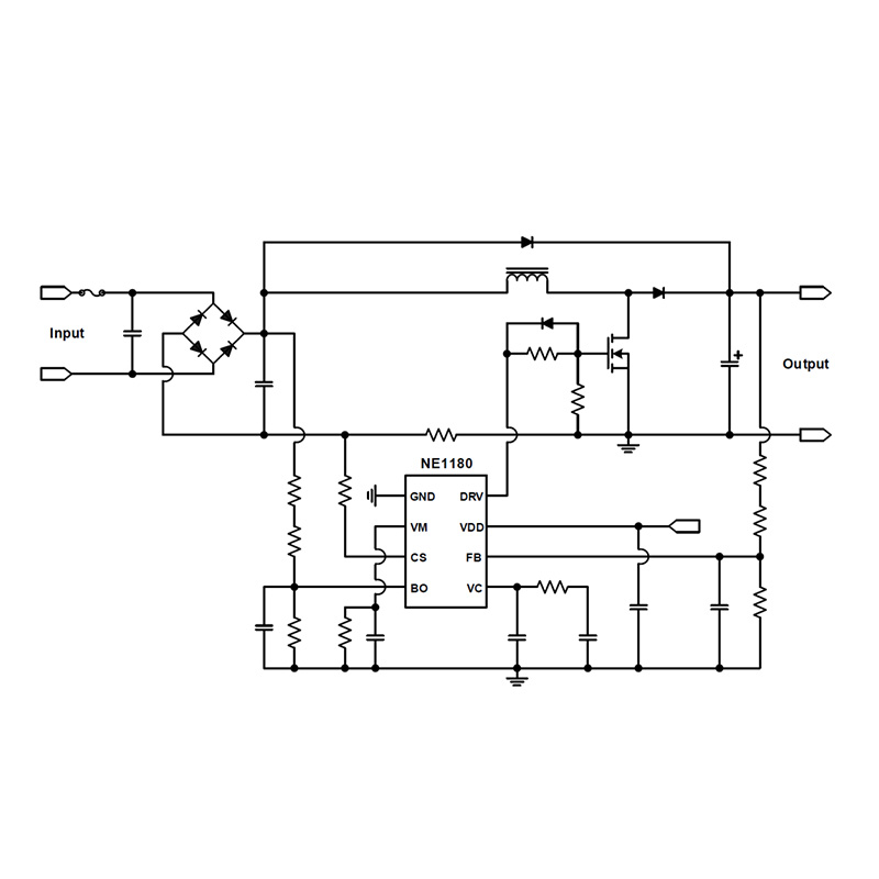 NE1180 — это контроллер для повышающих предварительных преобразователей с непрерывной коррекцией коэффициента мощности (CCM). В режиме фиксированной частоты он контролирует время включения силового ключа (ШИМ) и зависит от мгновенного тока катушки. Схема выполнена в SO-8, что минимизирует количество внешних компонентов и значительно упрощает реализацию PFC. Он также включает в себя высокие функции безопасности для эффективных цепей ограничения неконтролируемой входной мощности.